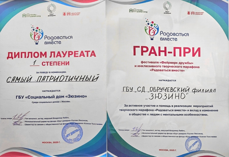 По итогам Фестиваля наш филиал получил диплом лауреата 1 степени за победу в номинации "Самый патриотичный номер" и Гран-При за активное участие и помощь в реализации мероприятий творческого марафона "Радоваться вместе" и вклад в изменение в обществе к людям с ментальными особенностями.