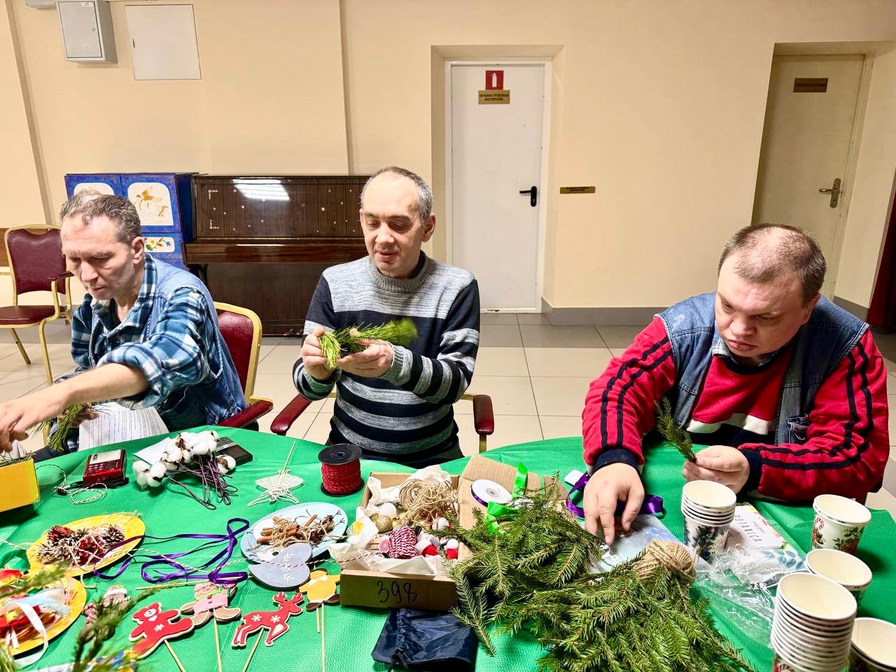 Мастер-класс «Новогодняя композиция» позволил жителям создать уникальные декоративные элементы с использованием натуральных материалов и простых инструментов. Для изготовления композиций были использованы ветви вечнозелёных деревьев (ель, пихта, туя), разнообразные украшения, бумажные стаканчики, ножницы и клей.