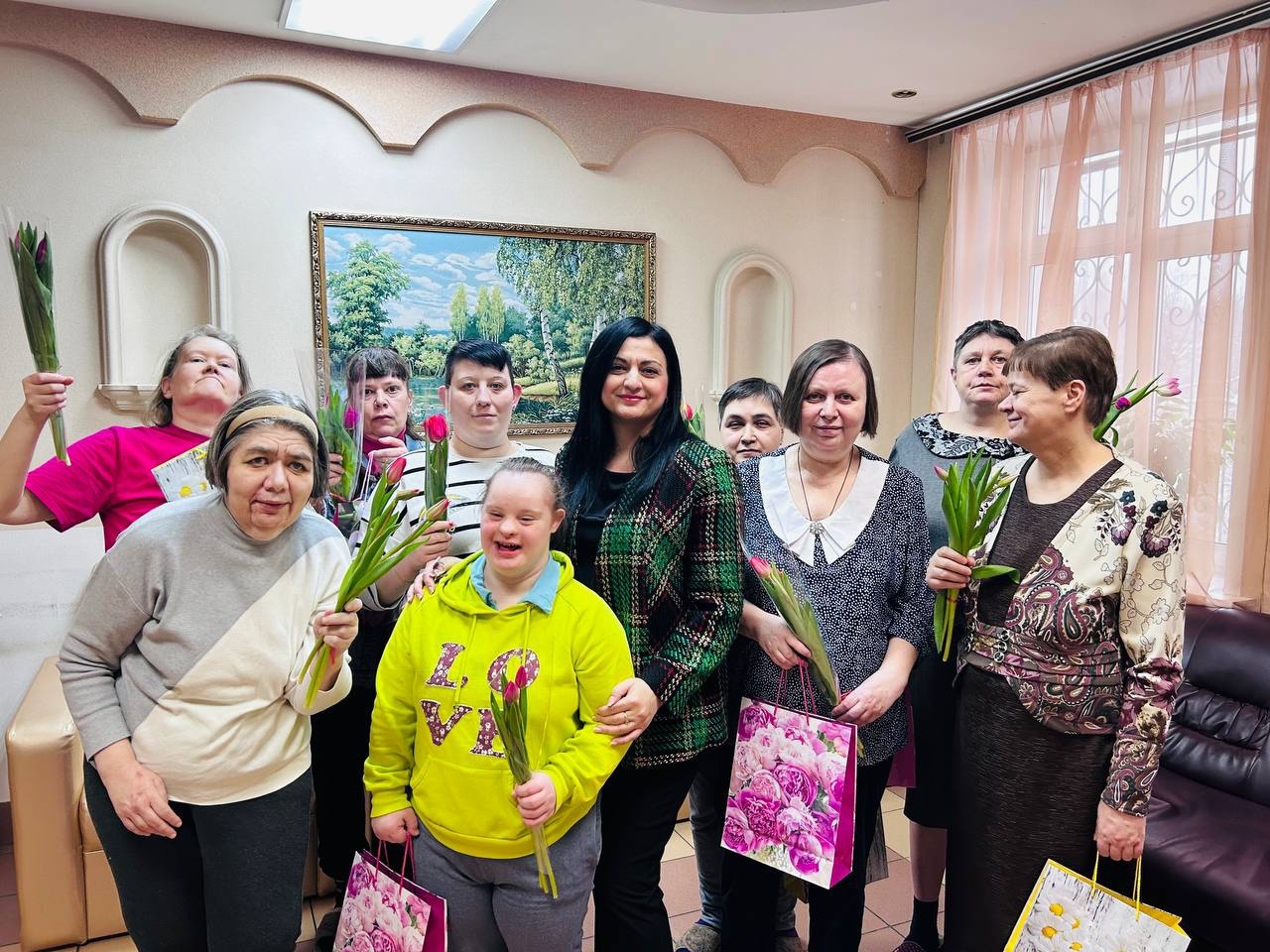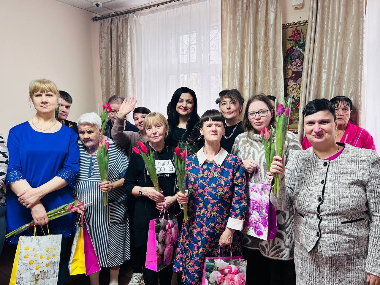 Заведующий филиалом «Зюзино» Кристина Размиковна Гаспарян вместе с сотрудниками социально-реабилитационного отделения поздравили наших милых дам с 8 Марта. Под праздничную музыку они вручили женщинам Филиала букеты тюльпанов, как символ весны, а так же памятные подарки.