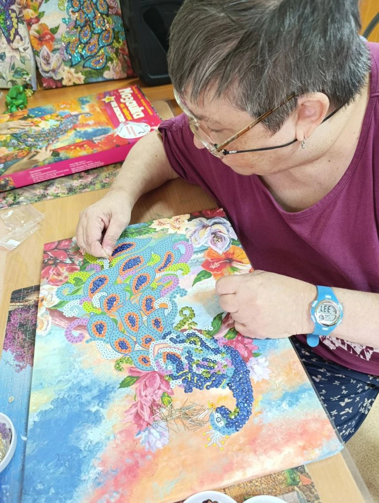 В эти часы в уютных комнатах царит особая атмосфера: здесь плетут и собирают картины из бисера и сверкающих паеток. Это кропотливое, но такое увлекательное занятие требует внимания и сосредоточенности. Глаза горят, пальчики ловко собирают мозаику — и вот уже на глазах рождаются яркие цветы, загадочные животные или мерцающие пейзажи. 🌺🦋