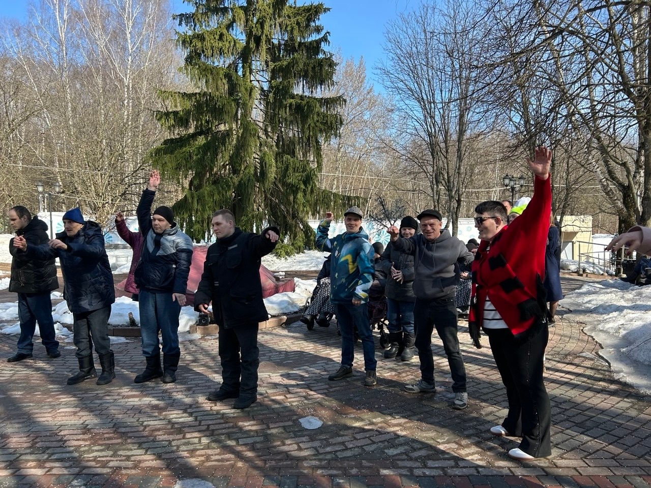 На этом активный отдых не закончился. После прогулки все дружно вышли на зарядку на свежем воздухе. Под бодрую музыку и под чутким руководством волонтеров участники выполнили комплекс упражнений, направленных на поддержание тонуса мышц и хорошего настроения.