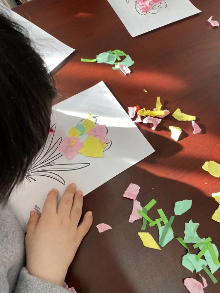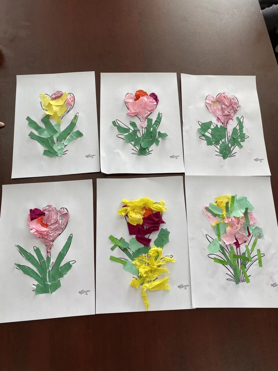 Вместо привычных ножниц — аккуратность пальцев и капелька вдохновения. Этот метод не только развивает мелкую моторику, но и удивительным образом успокаивает и настраивает на позитивный лад. Сначала мы подбирали цвета, потом бережно отрывали маленькие кусочки бумаги, чтобы выложить из них нежные лепестки, пышные серединки и тонкие стебельки.
