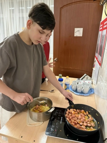 Проект "Пока все дома" в филиале «Беляево» продолжает свое развитие и набирает обороты. Воспитатель Тарасова Наталья Игоревна со старшими воспитанниками приготовили макароны с жареными сосисками, луком и морковью.