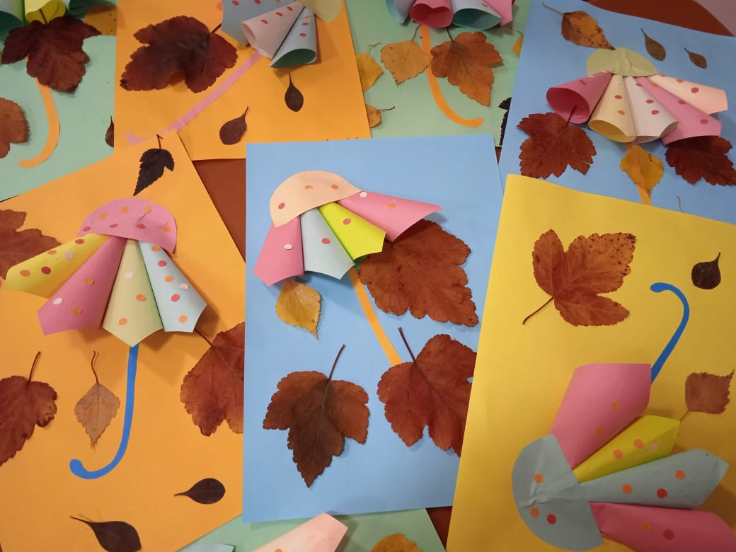 В ход пошли самые осенние материалы: яркая цветная бумага, сухие листья, травинки и веточки. Итог кропотливой и вдохновенной работы — вот такая замечательная аппликация «Осенний зонтик»!