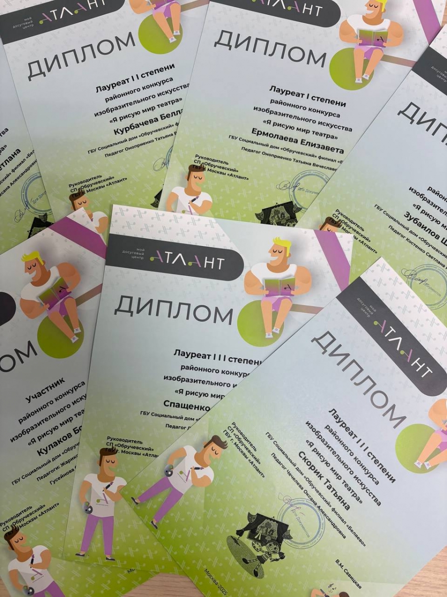 Подведены итоги районного конкурса изобразительного искусства «Я рисую мир театра» в досуговом центре «Обручевский. Атлант». Более 200 человек приняли участие в конкурсе. Это школьники, пенсионеры, жители района и все желающие. Традиционно воспитанники филиала «Беляево» Социального дома «Обручевский» являются активными участниками конкурсов, проводимых «Атлантом». Под руководством педагогов у ребят рождаются яркие неповторимые картины. А количество призовых мест нас вдохновляет на новое творчество! 19 дипломов победителей и лауреатов завоевали воспитанники филиала в конкурсе «Я рисую мир театра»!