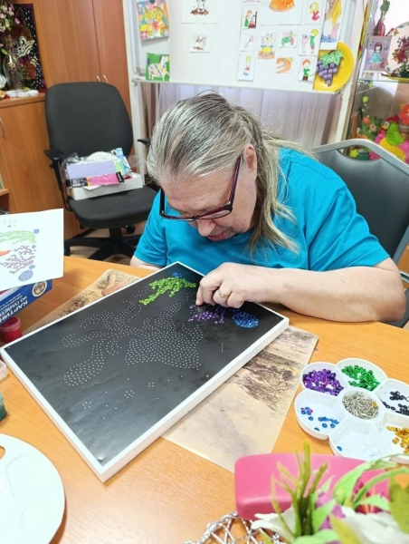 В эти часы в уютных комнатах царит особая атмосфера: здесь плетут и собирают картины из бисера и сверкающих паеток. Это кропотливое, но такое увлекательное занятие требует внимания и сосредоточенности. Глаза горят, пальчики ловко собирают мозаику — и вот уже на глазах рождаются яркие цветы, загадочные животные или мерцающие пейзажи. 🌺🦋